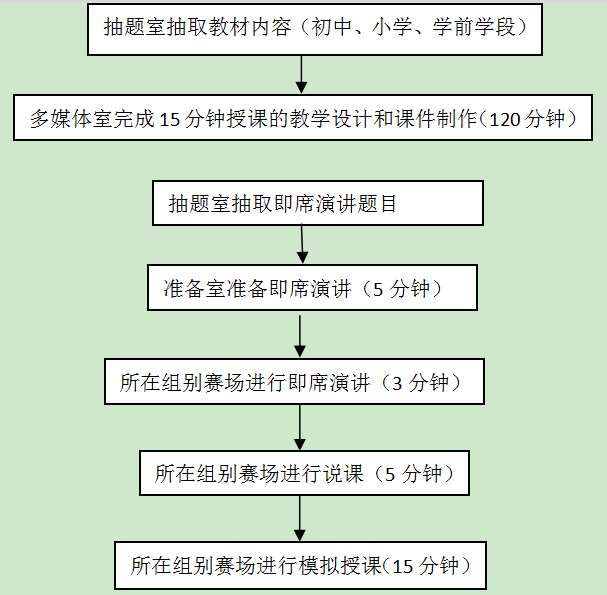 2.比赛由教学设计(含课件)、即席演讲、说课、模拟授课四个环节构成。大赛设计学段为学前及中、小学,内容以课程标准为准,不指定教材。大赛总分数为100分,其中,即席演讲满分20分,说课30分,模拟授课满分50分,教学设计(含课件)不计分。