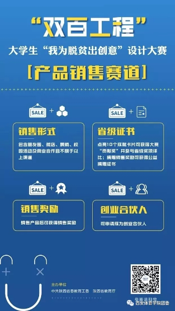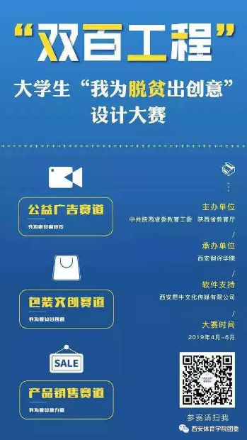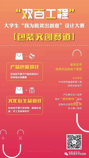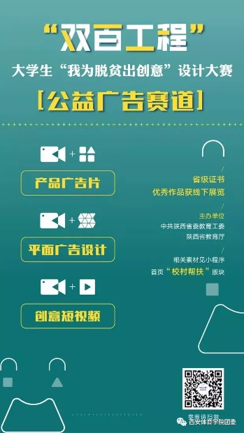 为深入学习贯彻习近平新时代中国特色社会主义思想和党的十九大精神,贯彻落实全国全省教育大会和高校思想政治工作会议精神,推动全省高校把立德树人作为根本任务,融入思想道德教育、文化知识教育、社会实践教育各环节,为广大青年学生提高综合实践能力搭建平台,努力形成全员全过程全方位育人格局。根据省委教育工委、省教育厅《关于举办“双百工程”大学生“我为脱贫出创意”设计大赛的通知》(陕教工团办[2019]2号)要求,校团委决定结合我校脱贫攻坚“双百工程”,举办大学生“我为脱贫出创意”设计大赛。现就大赛有关安排通知如下: