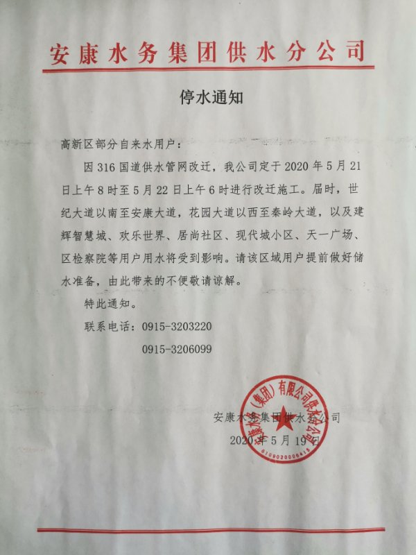 红足一1世2站江北校区: 接自来水公司通知,因316国道主供水管网改迁施工,届时江北片区将停水,我校江北校区在本次停水范围内。请江北校区全体师生提前做好储水准备。 停水时间:2020年5月21日08:00至5月22日08:00 特此通知。