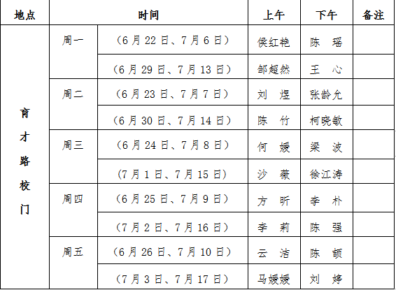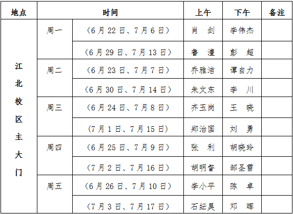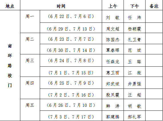 一、工作时间 1.2020年6月22日——7月17日, 2.上午:7:50-12:10, 下午14:20-18:20 二、工作职责 1.做好学校封闭式管理期间门禁管理制度的宣传和解释工作。 2.协助做好人员登记、证件检查、体温测量等工作。 3.协助做好矛盾、纠纷的化解工作。 4.协助处理突发事件。 三、值班安排